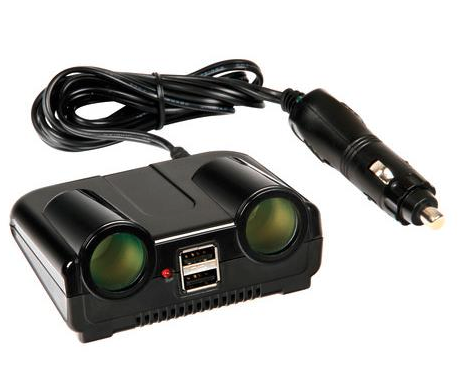 Multiprise avec double prise allume cigare et 2 ports USB pour lecteurs MP3, PDA, téléphones, GPS, etc. Ce produit convient à toutes les prises allume-cigares 12 / 24V