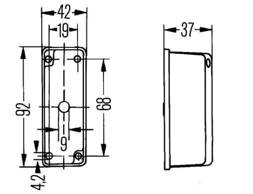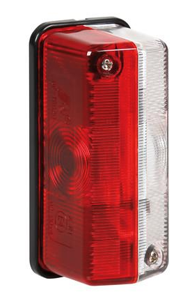 Feu d'encombrement de position bicolore (rouge/blanc) pour montage en saillie latéral. Homologué ECE- ADR/GGVS. Dimensions : 92 mm x 42 mm