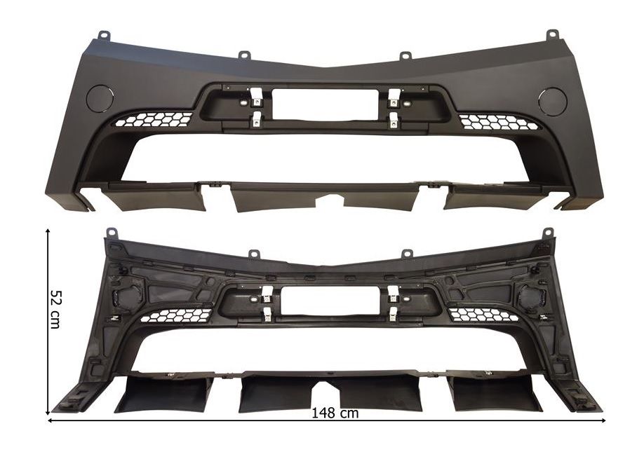 Le pare-chocs central avant se fixe à l'avant de la cabine du camion, sous la calandre. Il est en plastique gris.